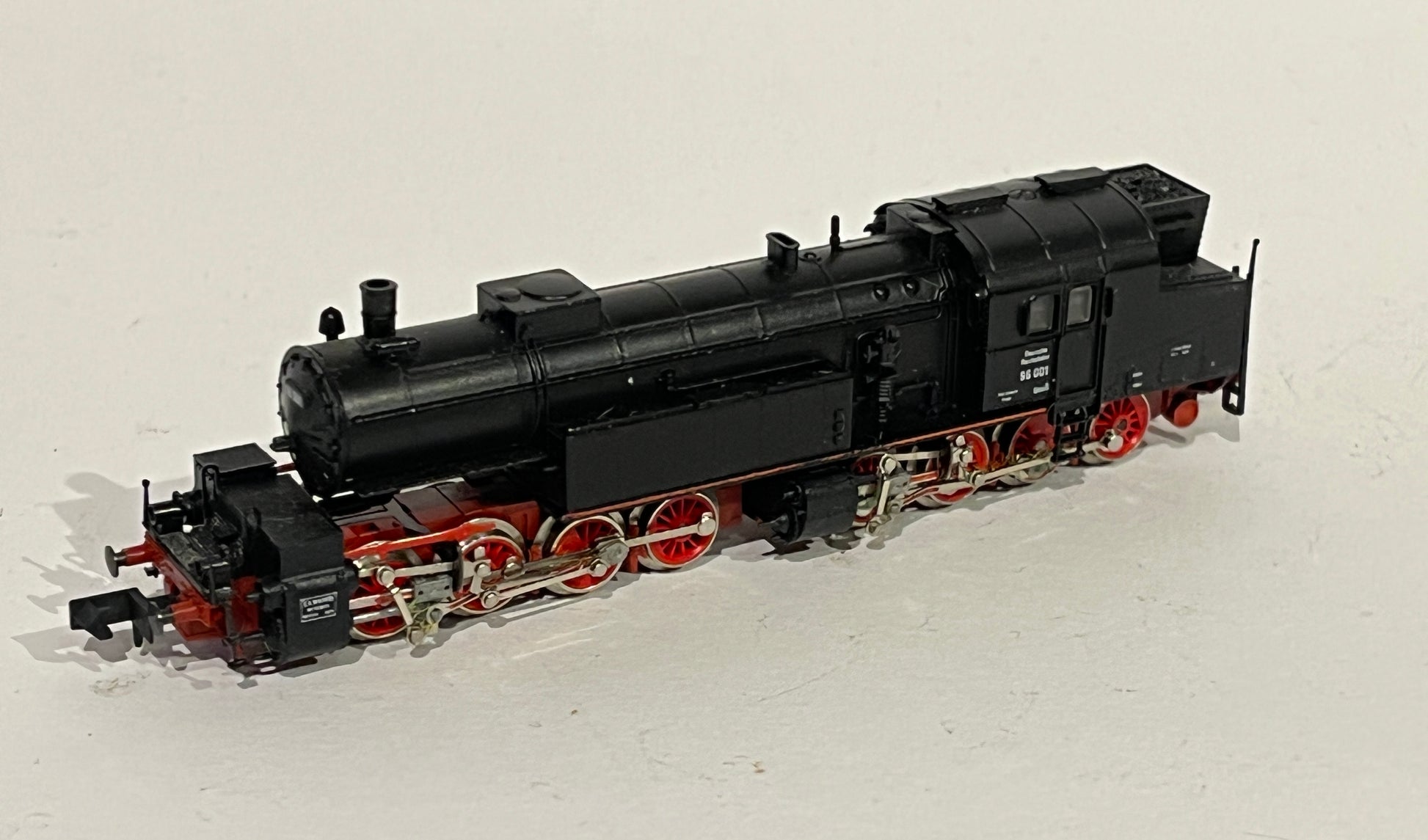 Länge über Achsen 111 mm, Gewicht 109 g, angetrieben von 16 Rädern, 2 Haftreifen, Kessel aus Metallguss, schwarzes Dach, rotes Fahrgestell und Räder, mit Zierlinien am Führerhaus, goldfarbene Kesselringe, dreifacher Scheinwerfer mit Wechsellicht.