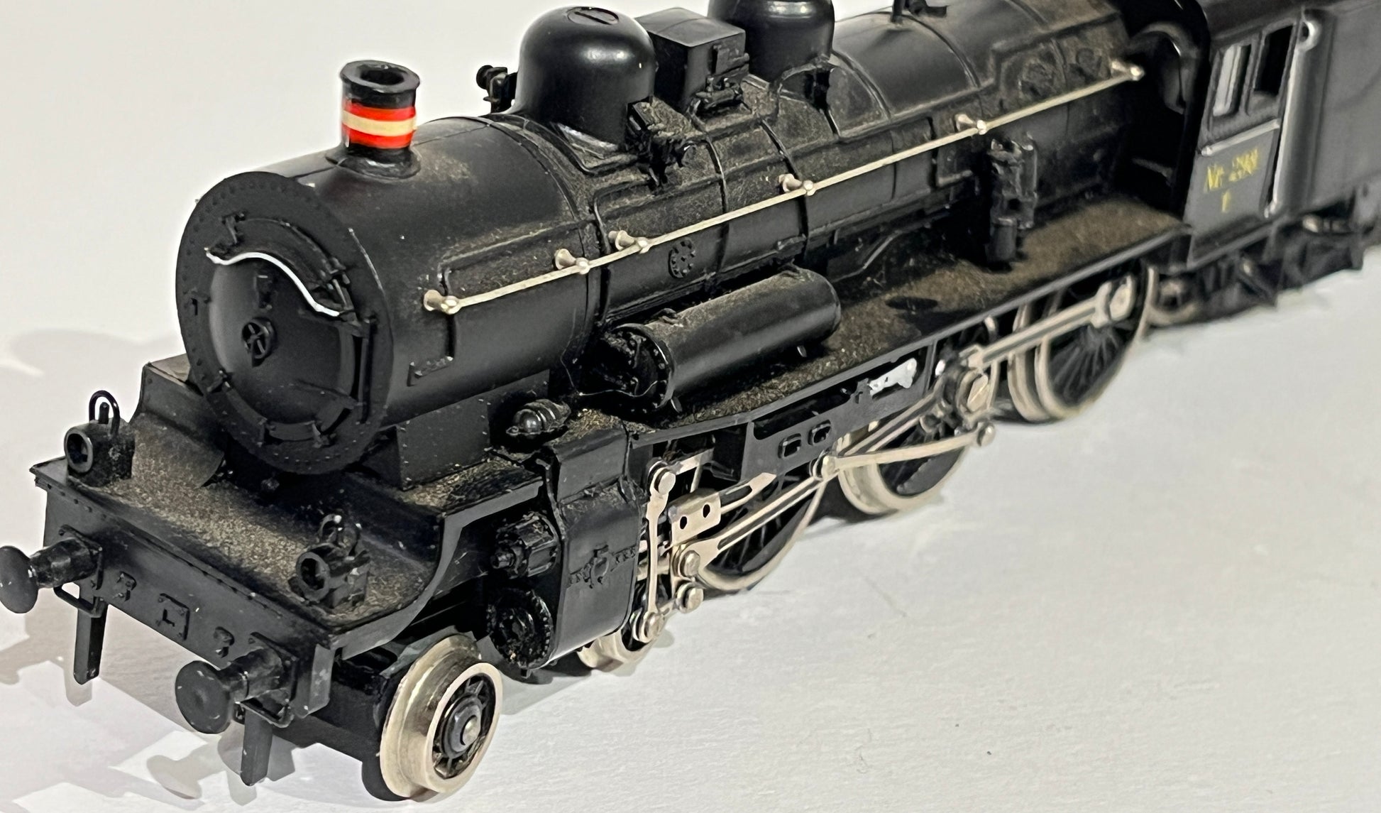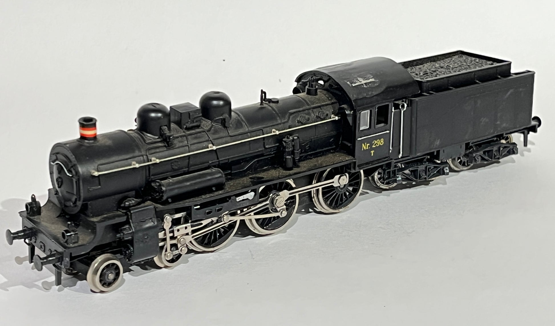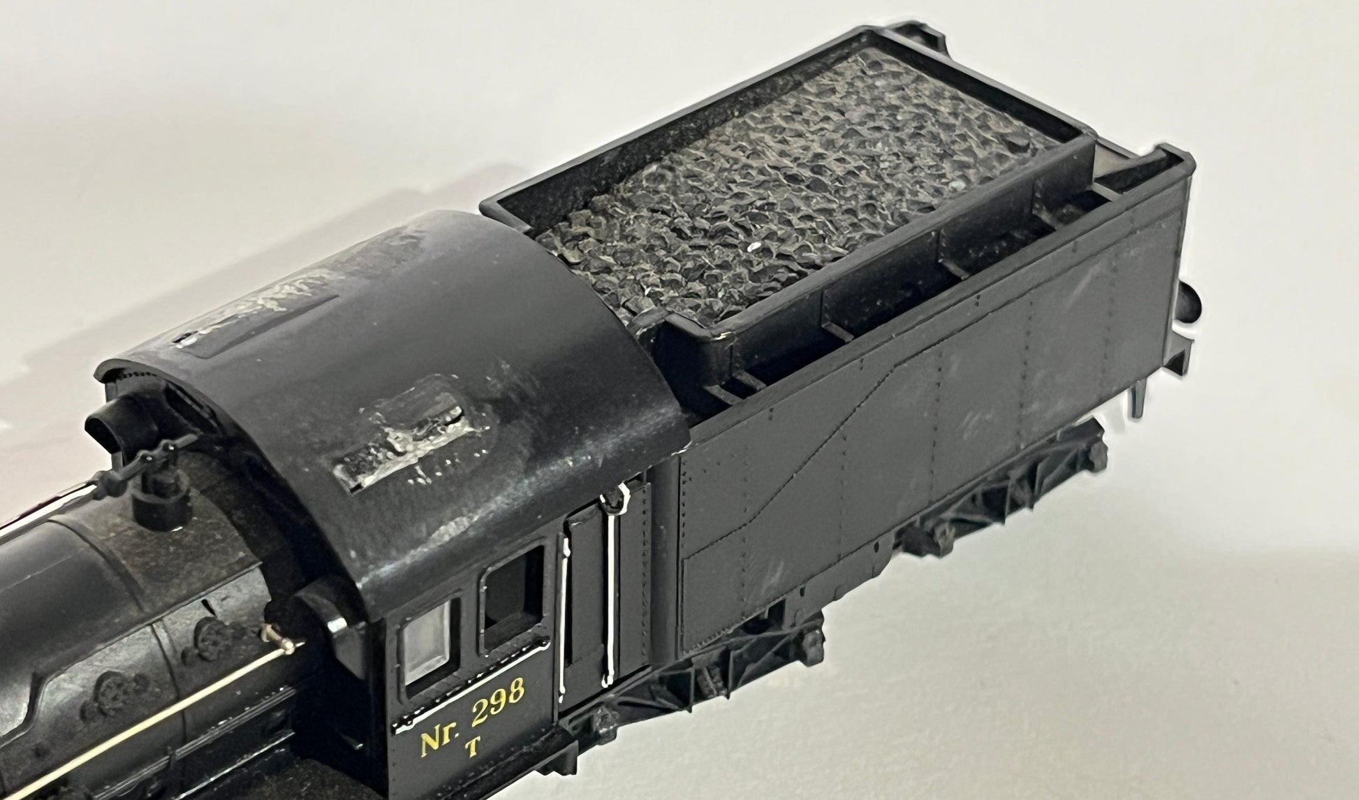 - Notiz: Die Lokomotive ist in Ordnung, aber das Führerhaus ist locker und hat ein Loch im Dach. Die Räder des Kohlewagens sind defekt, lassen sich aber möglicherweise reparieren. Perfekt als Standmodell auf einer Gleisanlage.