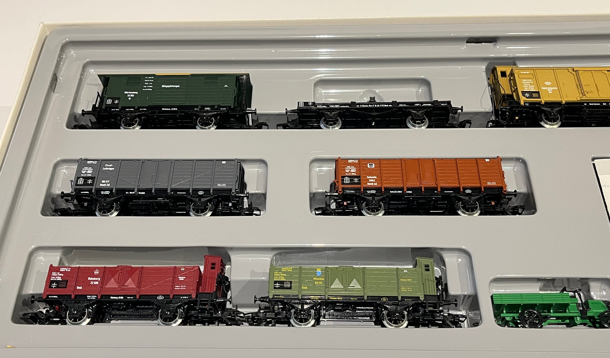 8 verschiedene Güterwagen der Staatsbahnverwaltung um 1910 und 1 Büssing-LKW-Modell, Metallgehäuse. Wagen mit Kunststoffgehäuse.
