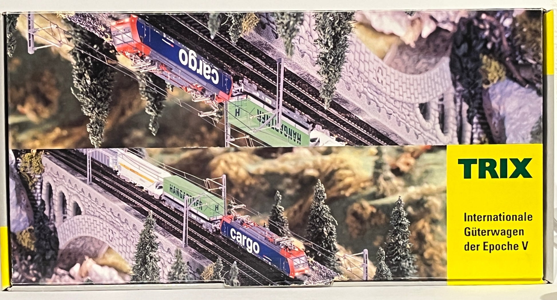 Verschiedene Güterwagen in der Gestaltung europäischer Eisenbahnen. Je 4 Containerwagen der Bauart Sgns, Getreidewagen der Bauart Uagpps, Schiebewandwagen der Bauart Habbins, Kesselwagen der Bauart Zas und Wannenwagen der Bauart Sdgmss. Epoche V.