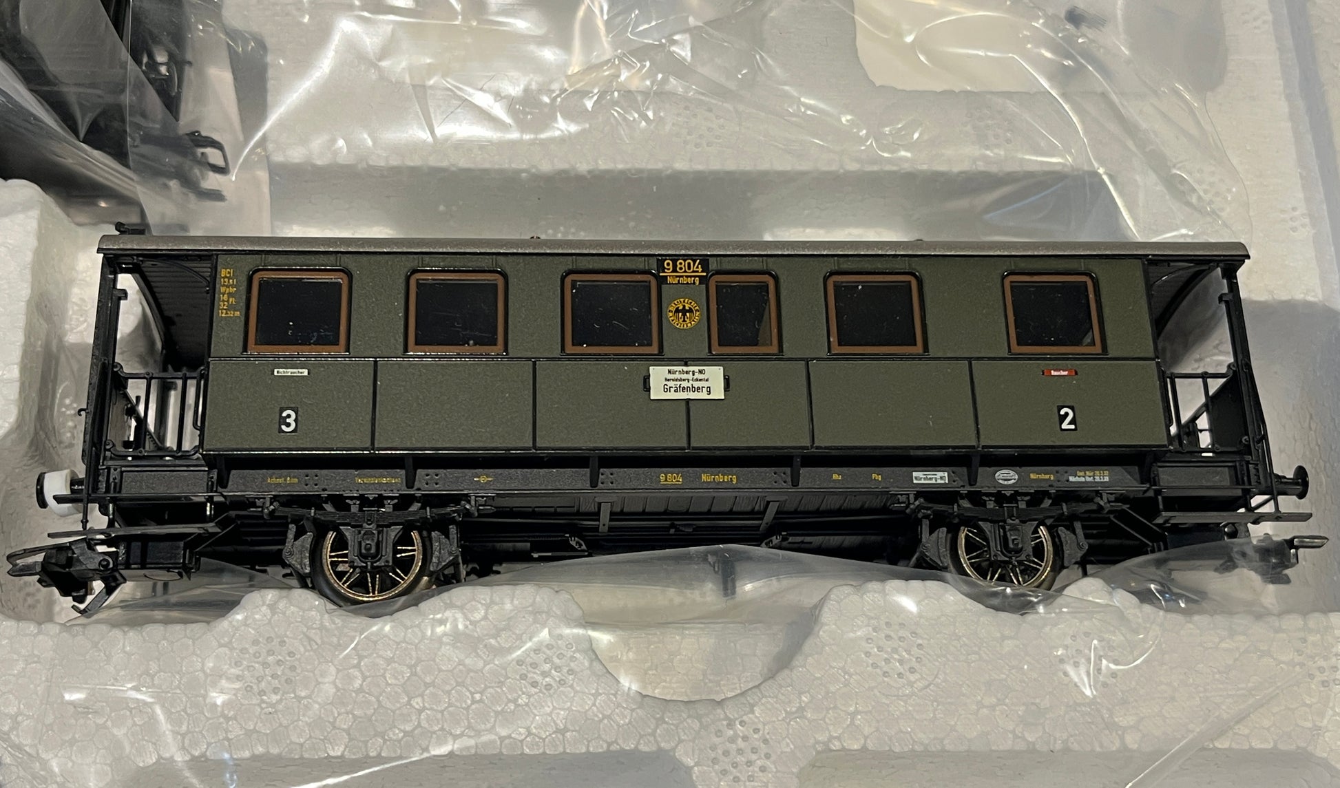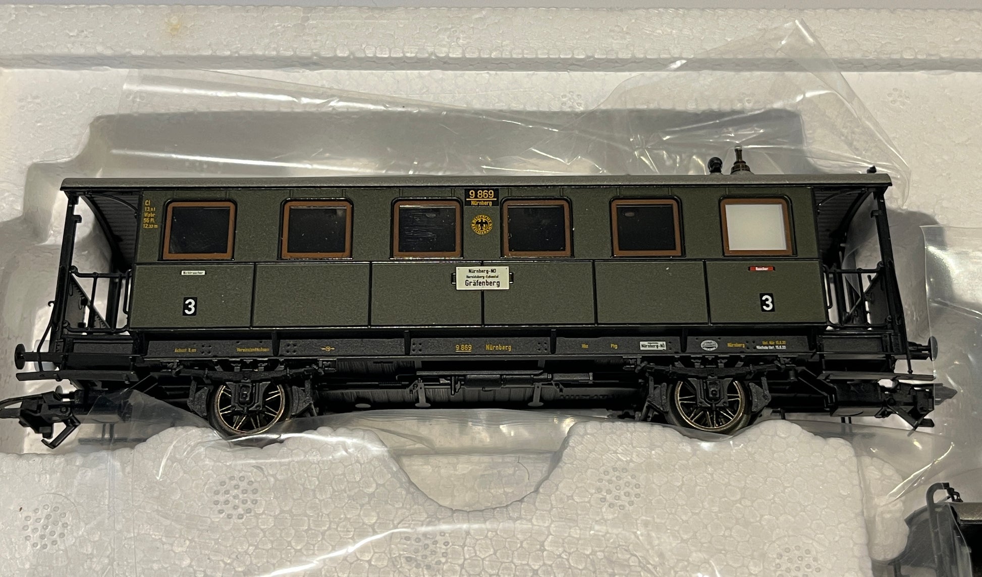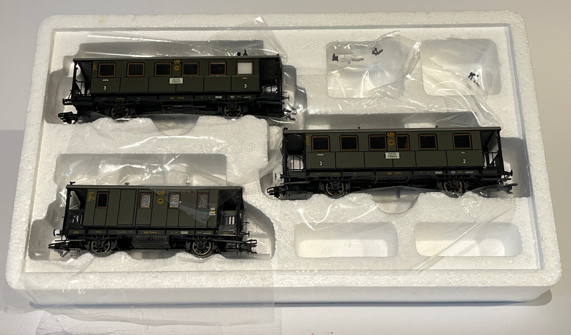 Prototype: German State Railroad Company (DRG), 3 branch line cars. Bavarian design. The cars look as they did around 1932. 1 type Cl passenger car, 3rd class, with a single large open seating area. 1 type BCl passenger car, 2nd/3rd class, with 2 compartments. 1 type PwPostL baggage car with mail area.