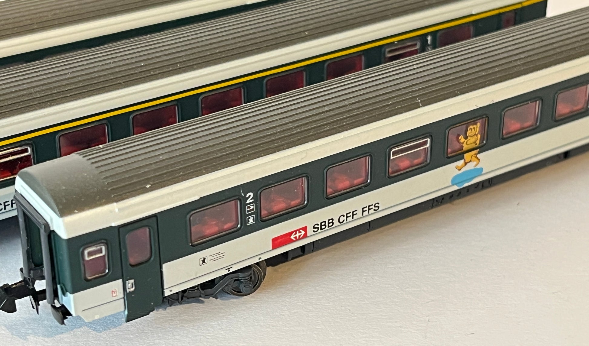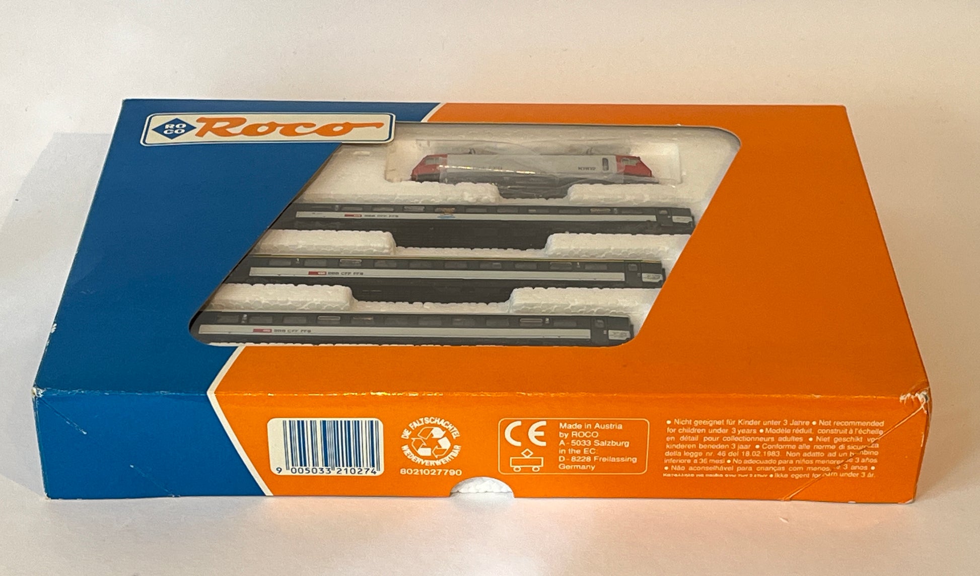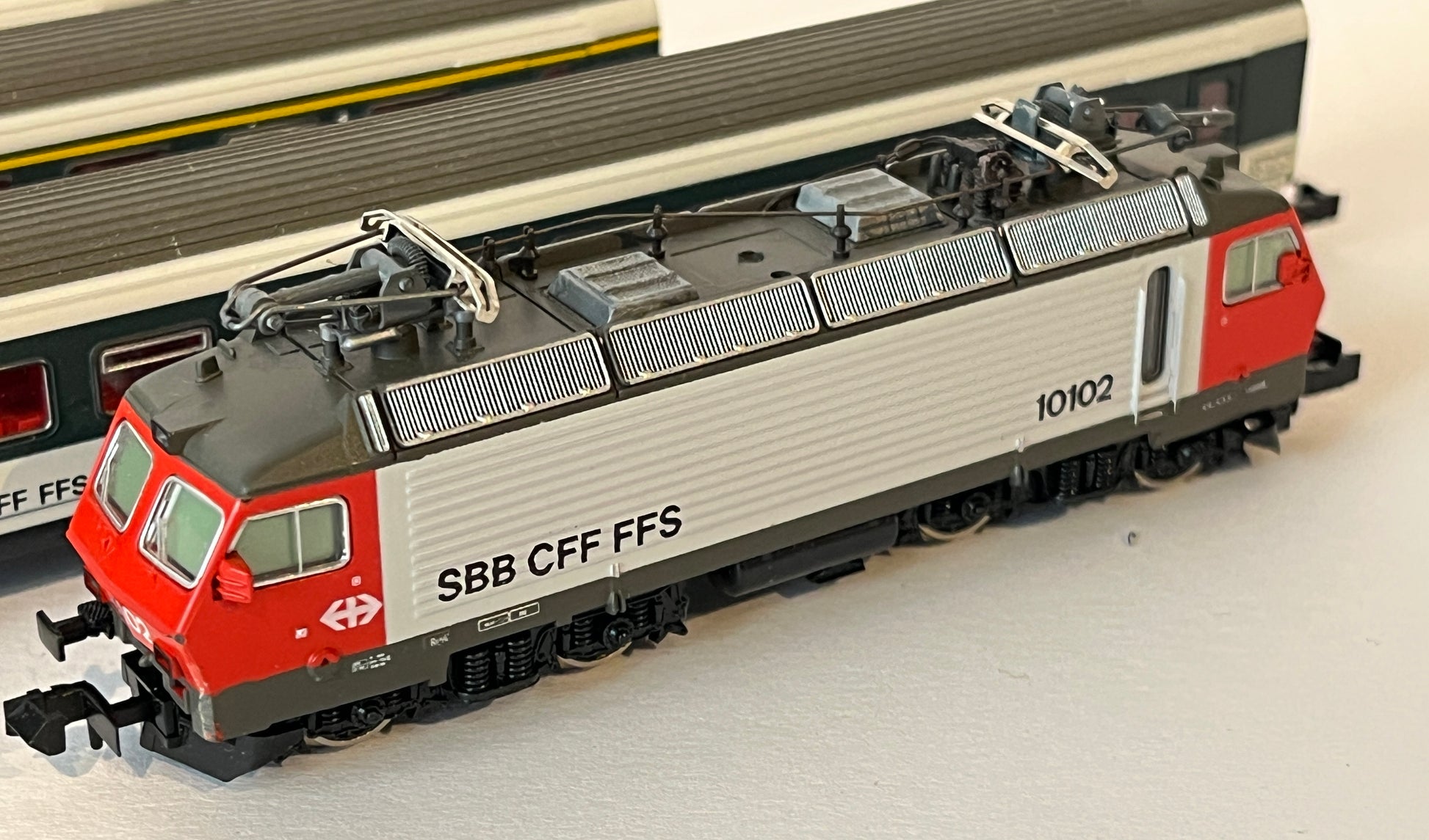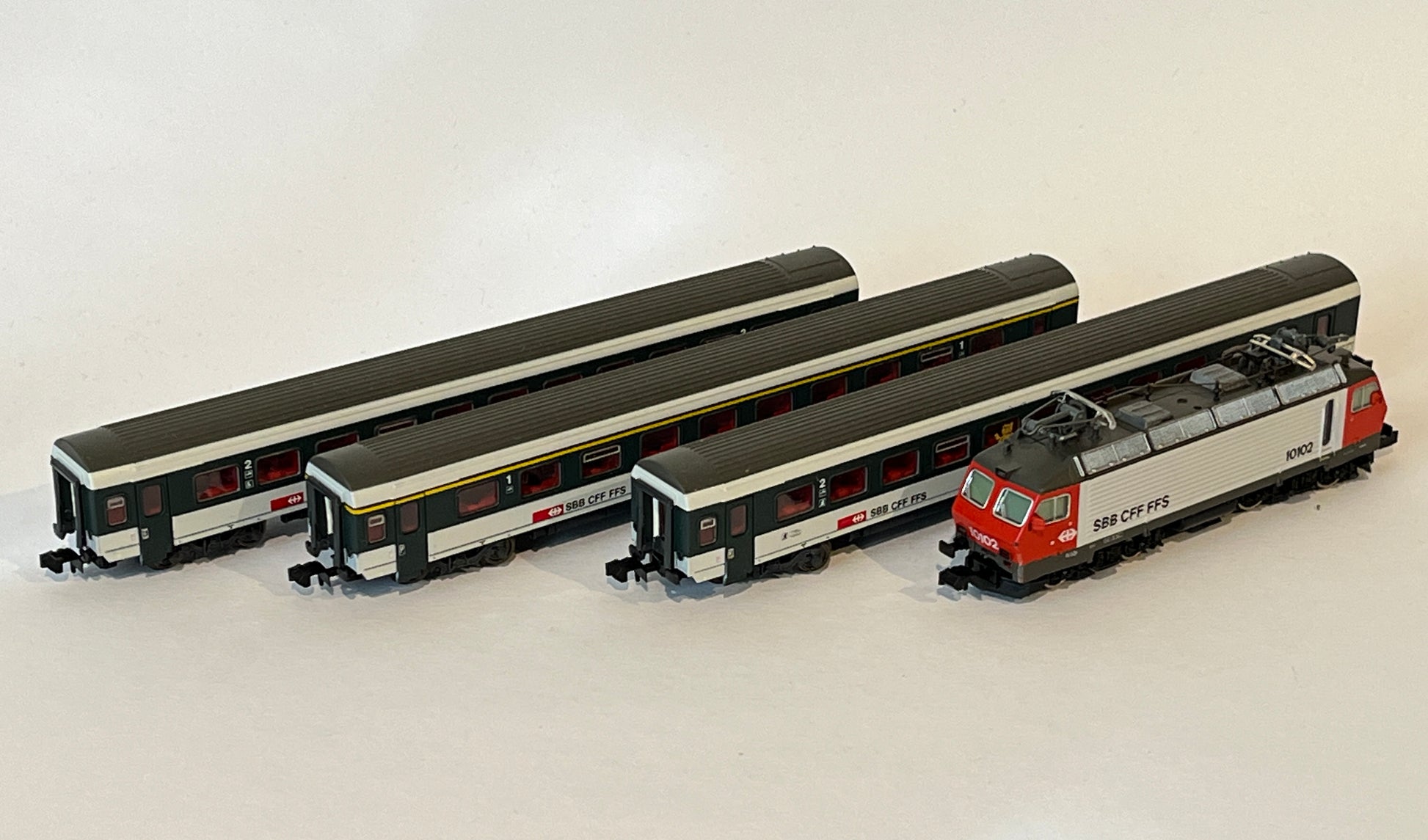 Train set with electric locomotive, series Re 4/4 IV, red/silver, and 3 express train carriages, type EW IV, each 4-axle, green/grey.