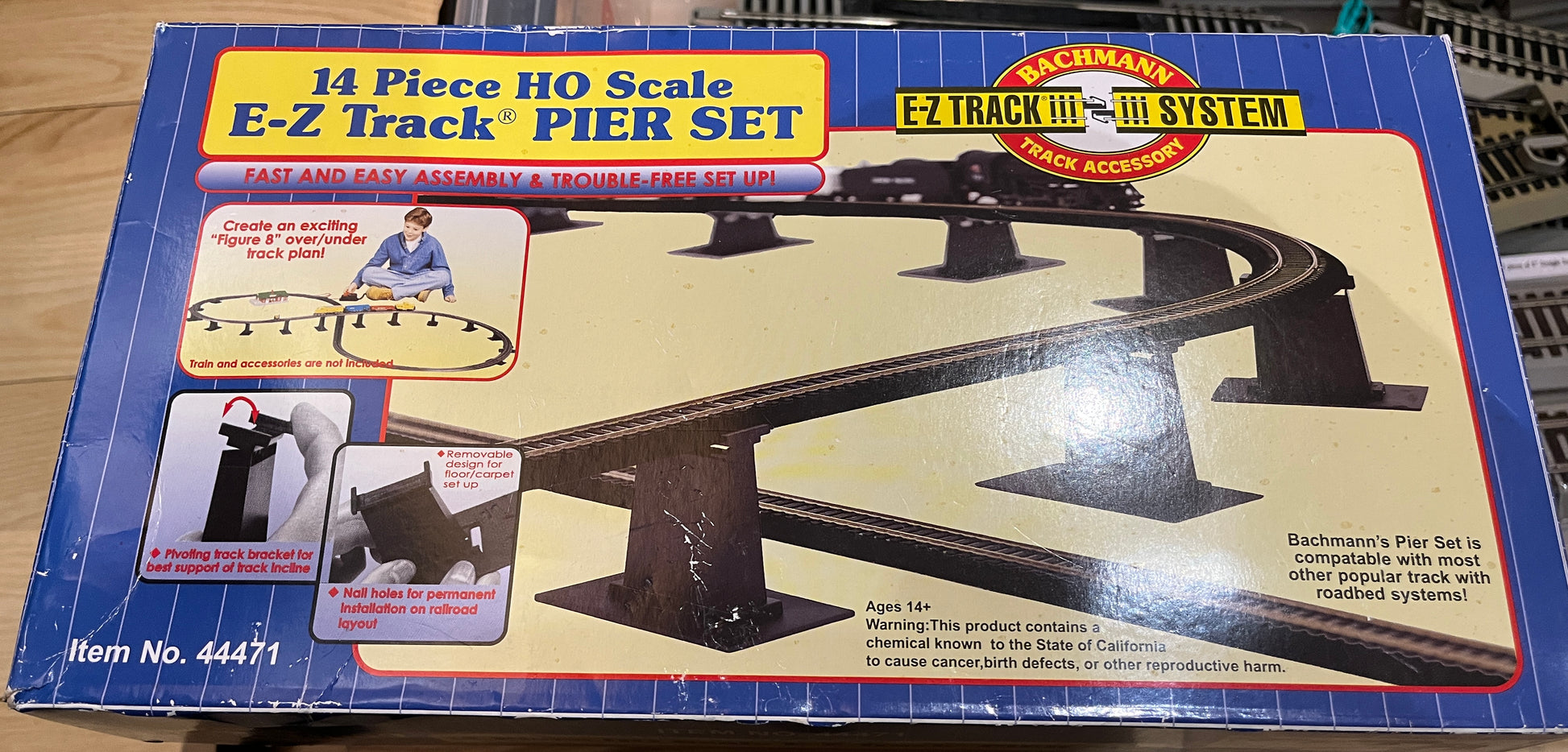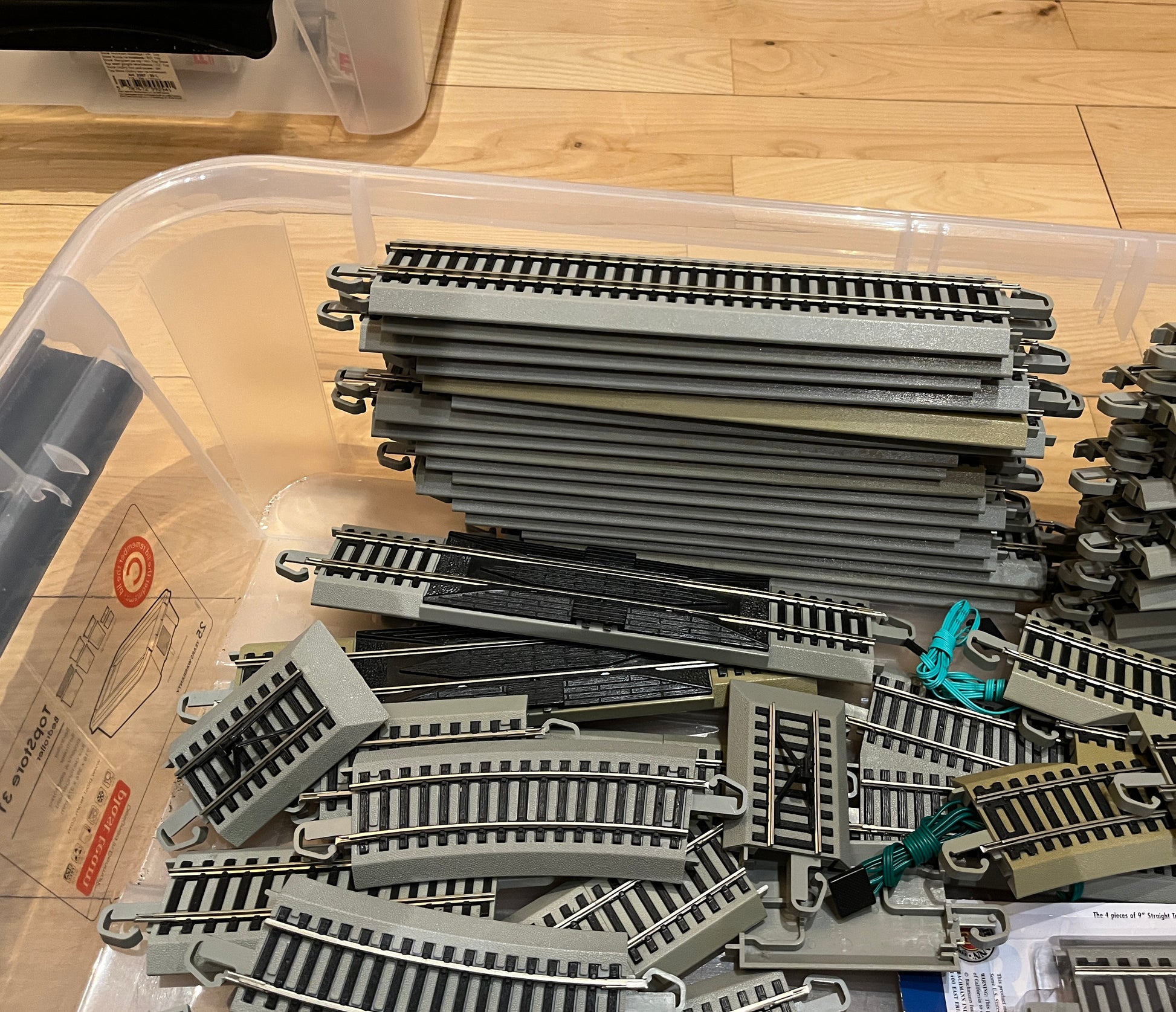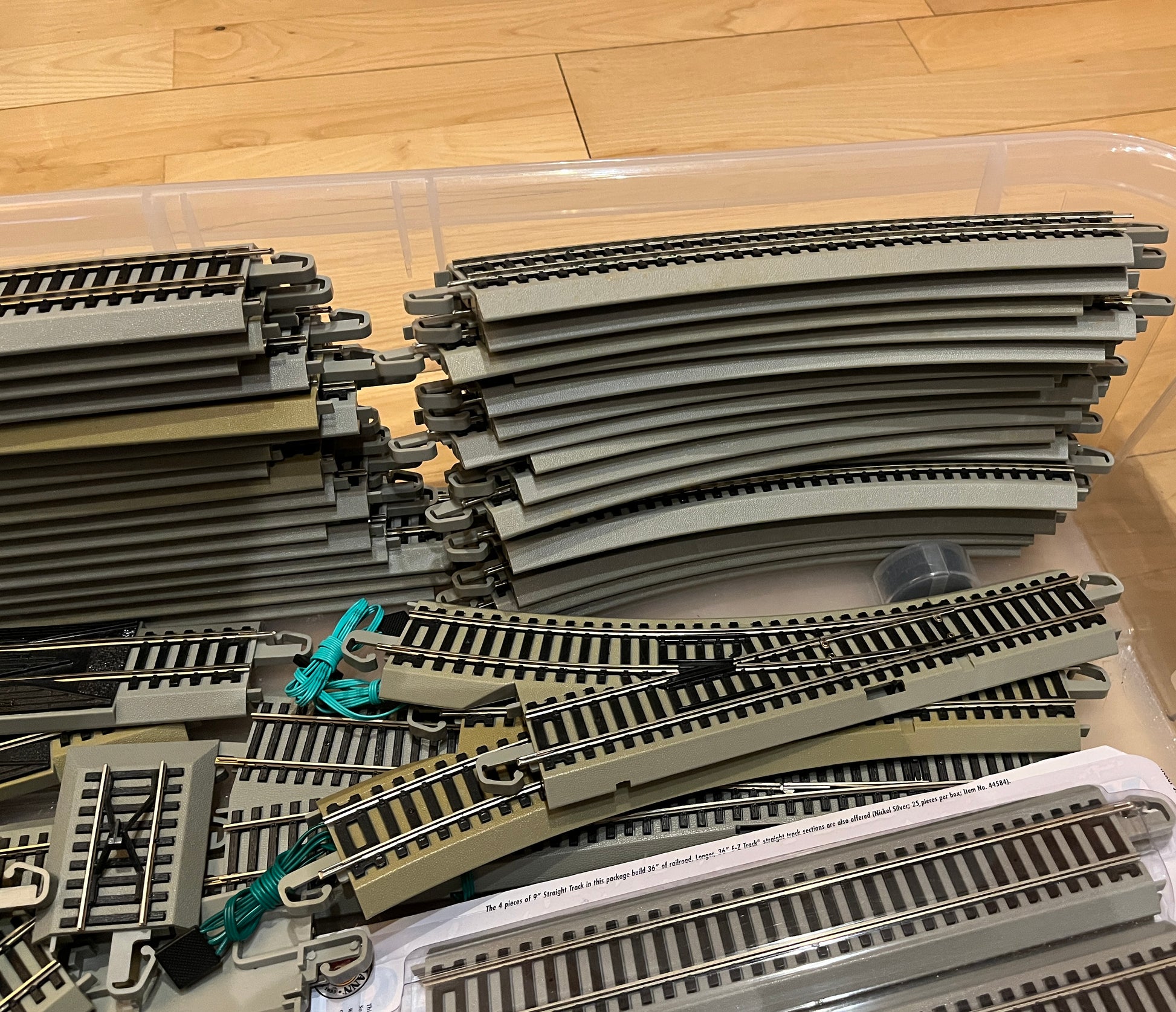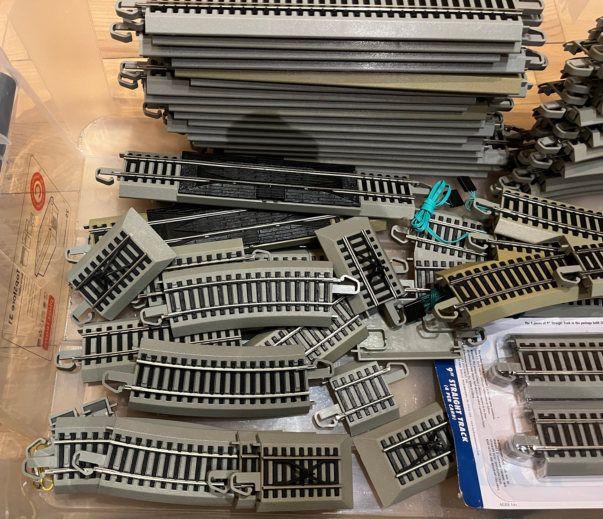Samling af Bachmann EZ-skinner, inklusive 20 lige skinner, 16 buede skinner, et antal korte skinner, 3 motoriserede sporskifter og en kasse med bropiller.