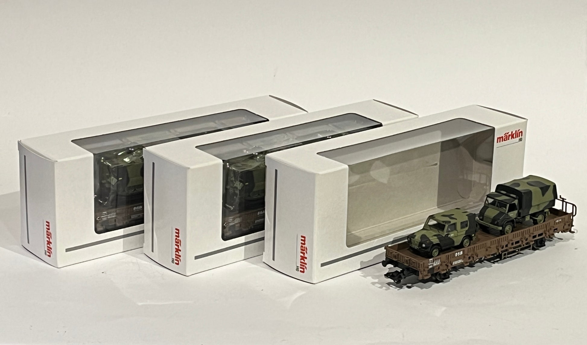 Tre lavsidevogne af typen Kbs fra Danske Statsbaner (DSB), lastet med forskellige køretøjer fra den danske hær. Version med bremseplatform. Prototyperne på militærkøretøjerne er: den lette pansrede mandskabsvogn M113, en S404 Unimog og Wolf gl.