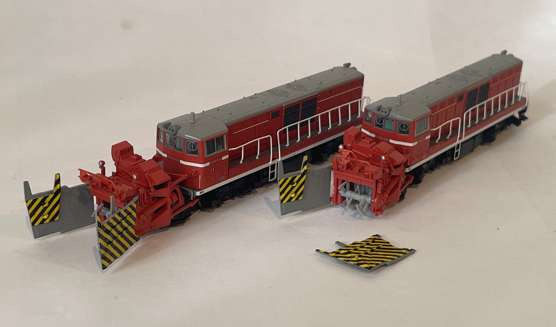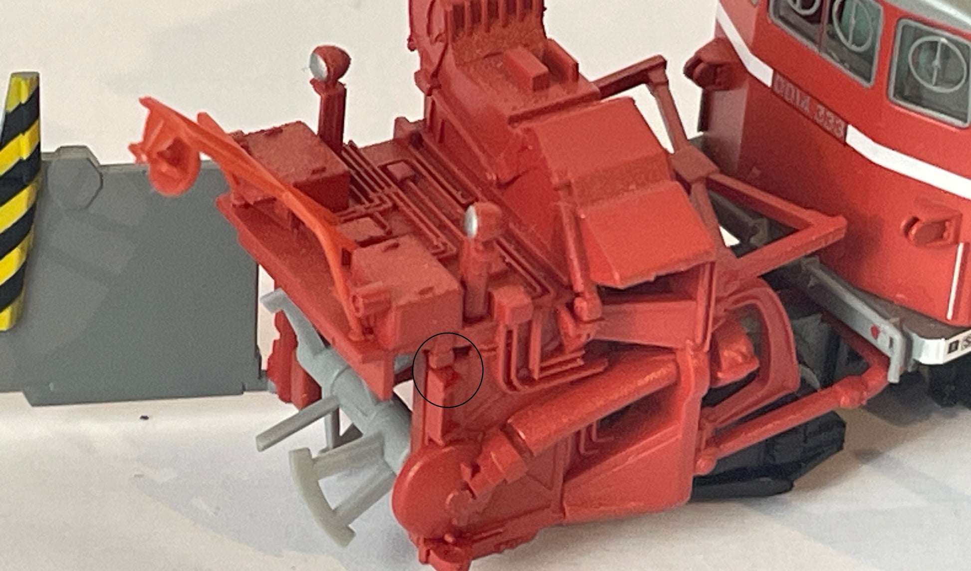 Desværre er en del faldet af eller brækket af, hvilket betyder, at én enkelt sneskærm ikke kan monteres på lokomotivet med motoren. Med lidt dygtighed kan det sikkert repareres. På et af billederne er den manglende del vist i en cirkel.
