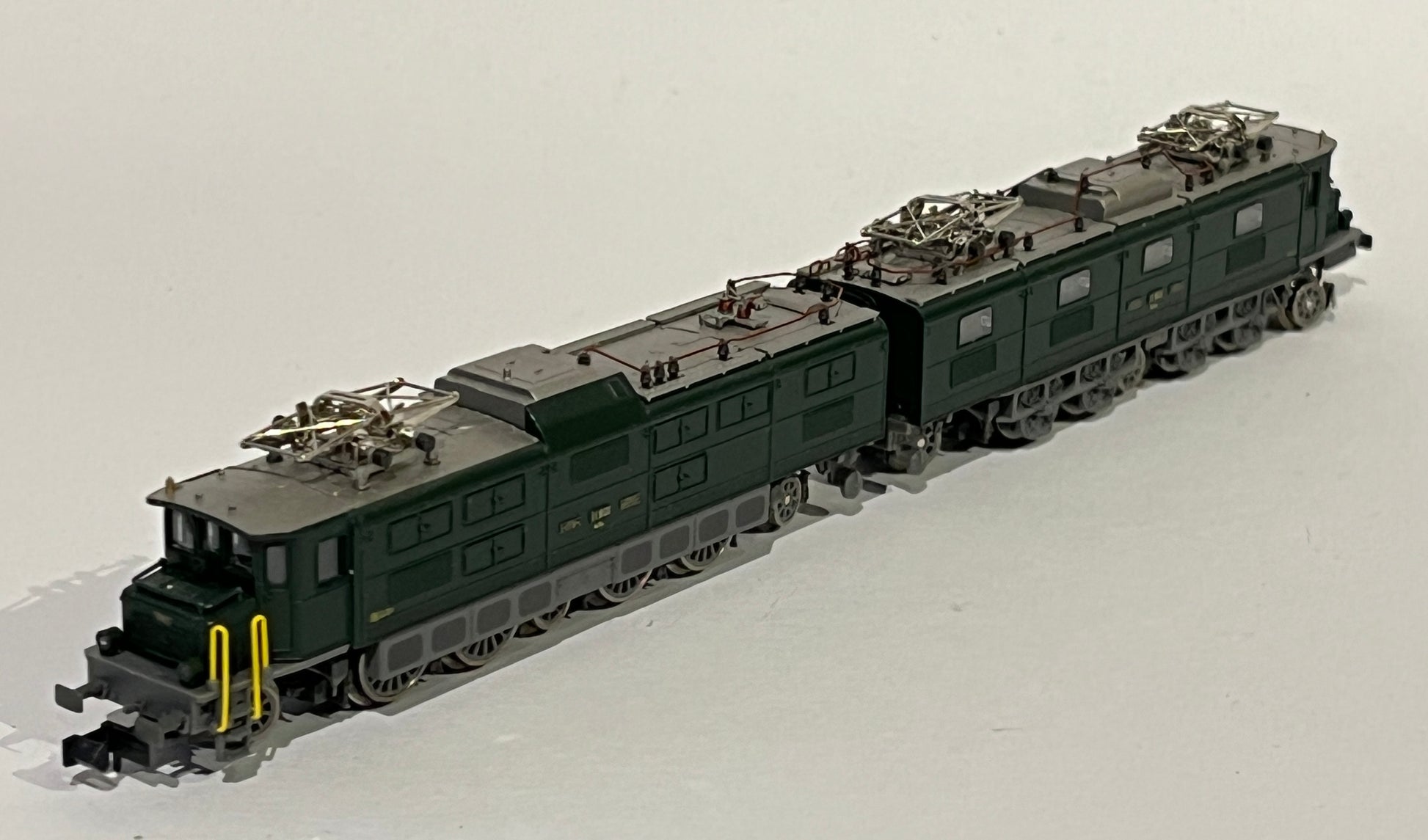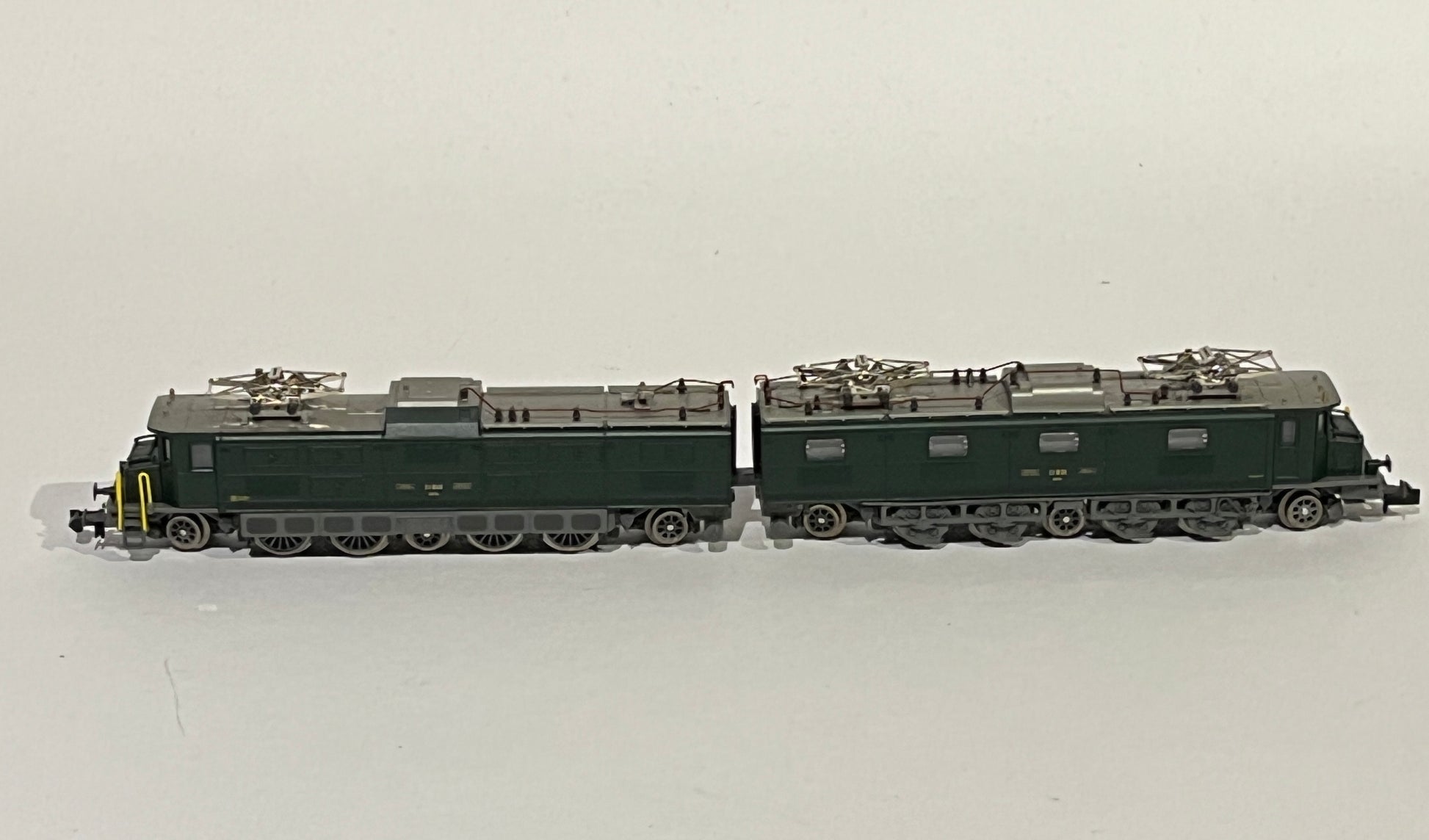 SBB Ellokomotiv Ae 8/14, hjularrangement (1′A) A1A (A1′) + (1′A) A1A (A1′), grøn, med 3 pantografer og Buchli-drev.