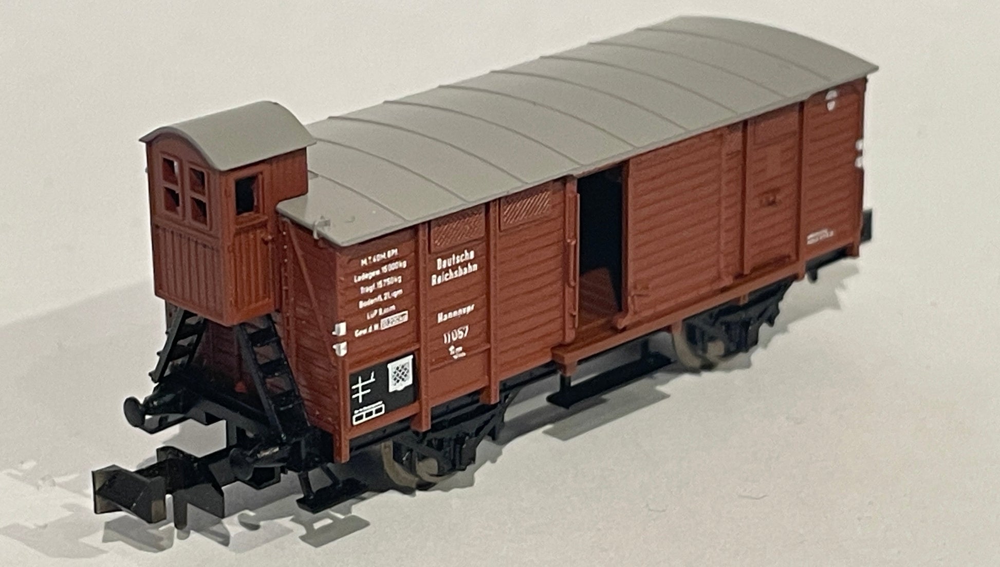 Godsvogn med bremsekabine .Brun. Dørene kan åbnes.