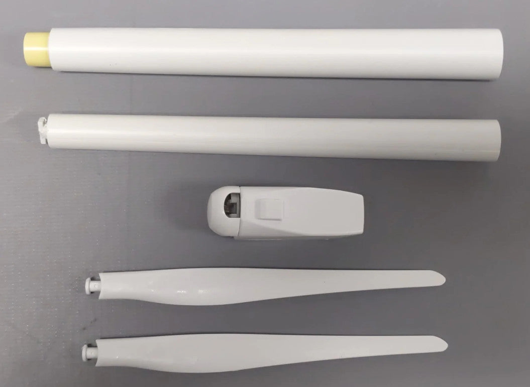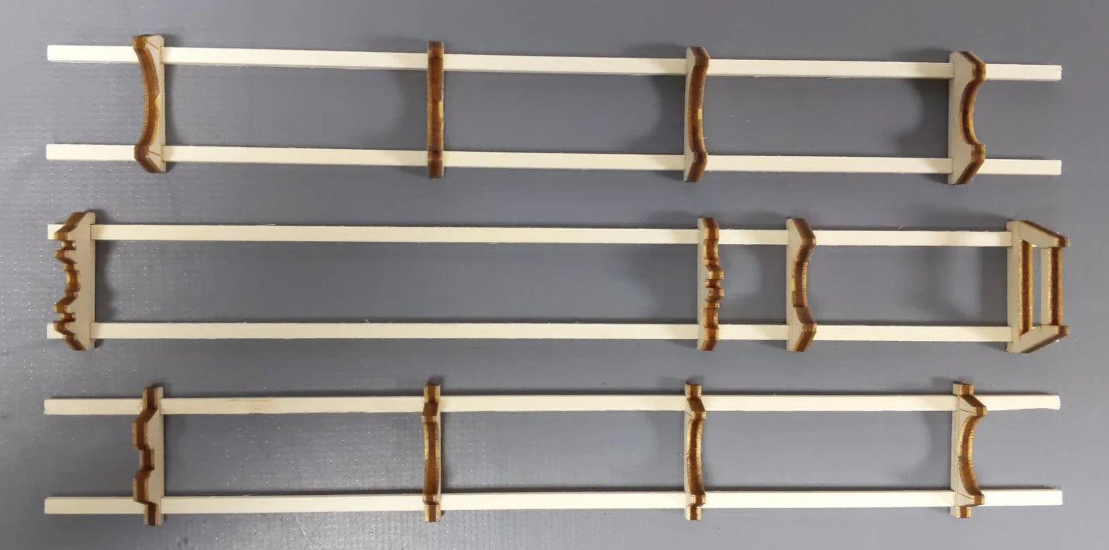 Era V. The cars have Minden-Siegen design or type Y 25 trucks. They also have metal inserts for good running characteristics. The stakes can be turned down. The underbody is specific to each car. The cars have many separately applied details. They also have NEM coupler pockets with a close coupler mechanism. The cars come loaded with parts for a wind power installation. Total length over the buffers 687 mm / 27-1/16".